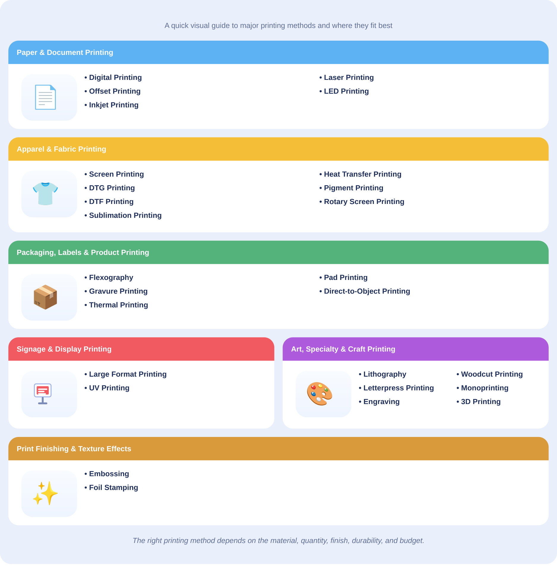 Here are the main types of printing, along with a few closely related print-finishing techniques that are often discussed alongside them—each suited to different materials, goals, and production needs.